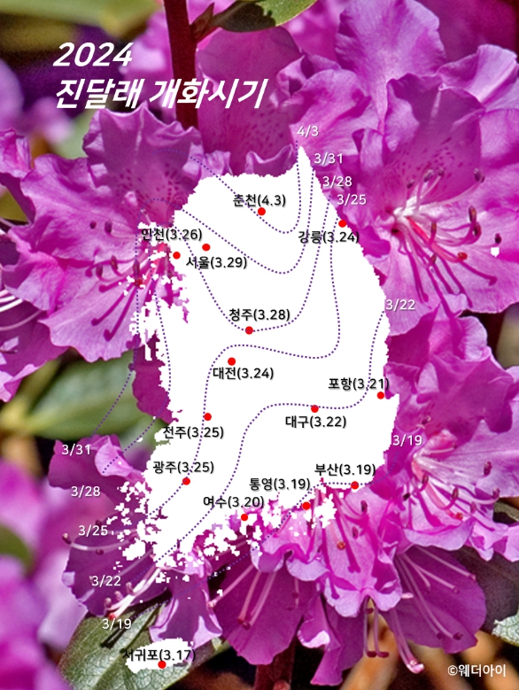 웨더아이는 2024년 올해 봄꽃은 평년보다 1~5일 정도 빠를 것으로 예측하고 있습니다.