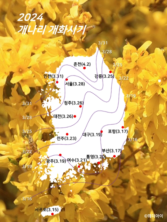 2024년 개나리 개화시기는 평년보다 3~11일 정도 빠를 것으로 예상됩니다.